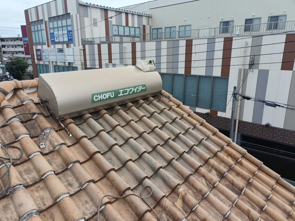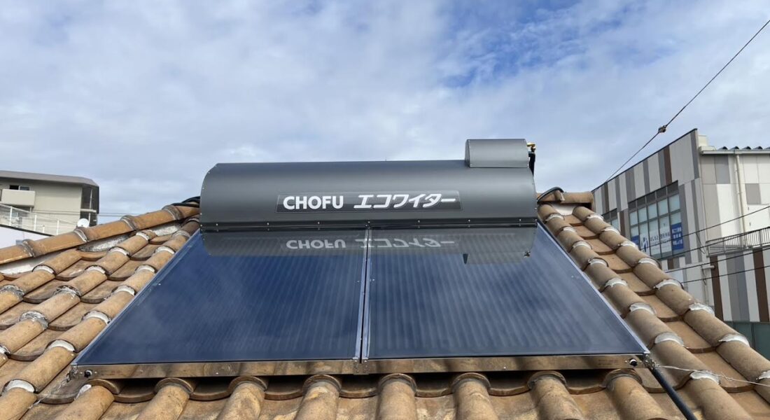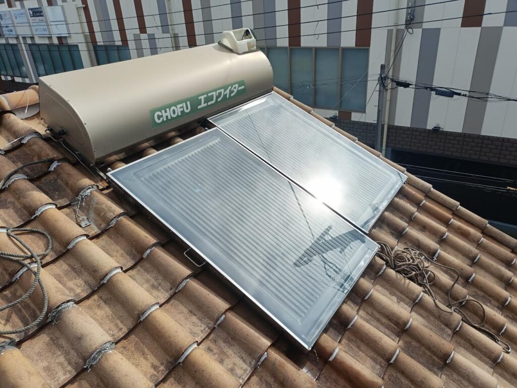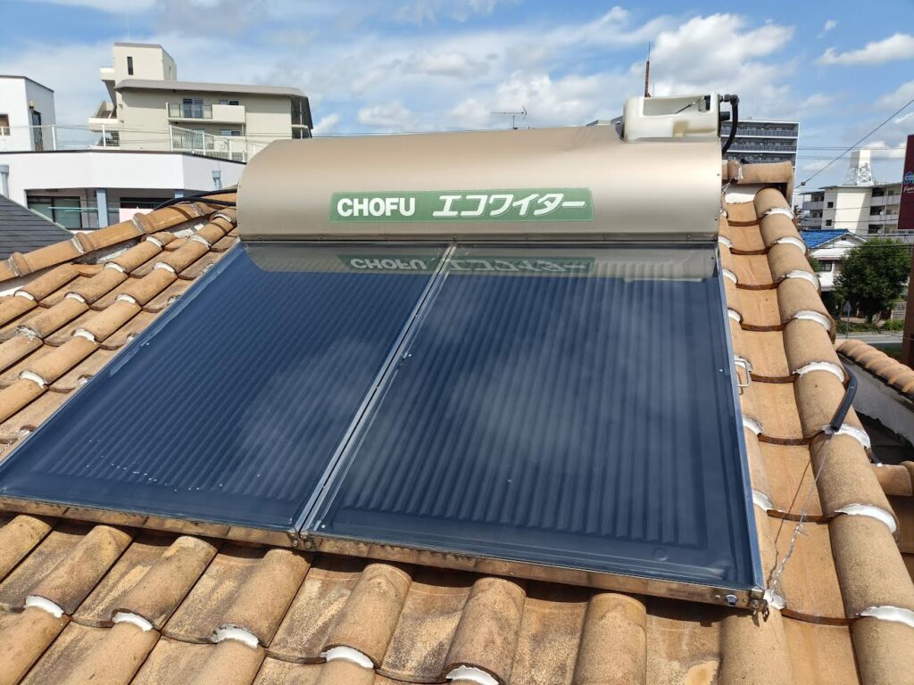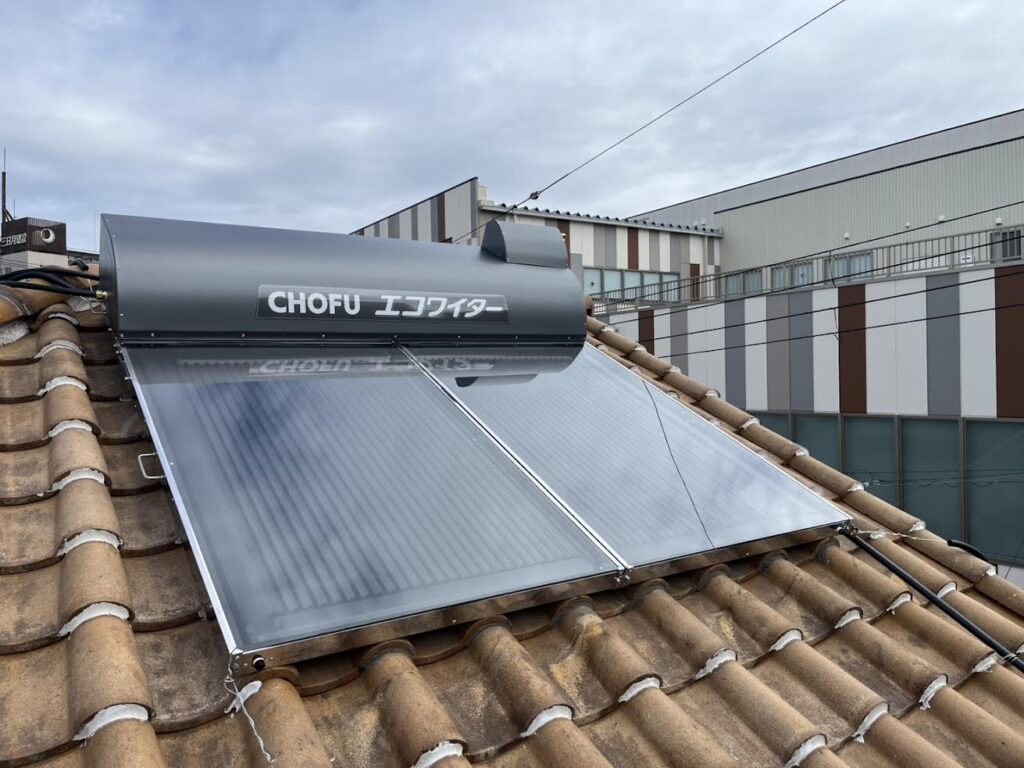 新しいエコワイターSW1-233を設置した写真です。新型はタンクが濃いグレーになり、カラス被害(早朝にタンクやホースをつついて大きな音を出す)が起きにくいです。一昔前の太陽熱温水器は塗装のないステンレス外装でカラスにつつかれる事がよくありました。長府製作所エコワイターはカラーステンレス鋼板なのでサビにも強く安心ですね♪