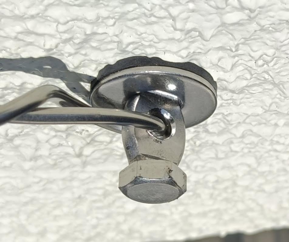 ステンレス番線の固定用ステンレスコーチ釘を垂木に打ち込んだ部分です。6mmのドリルで下穴をあけてからねじ込んでます。