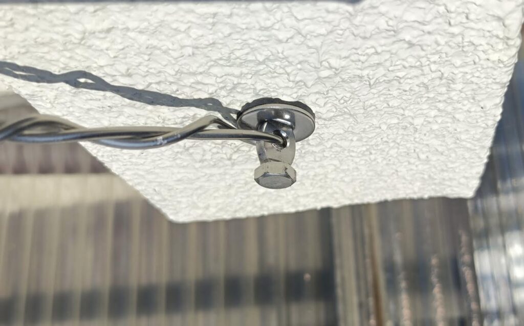 ワッシャーと壁の間にはパッキンを入れて雨水が入らないように施工させて頂いています。固定番線の取り付け方は現場により様々ですがしっかり固定出来るように最善の施工をさせて頂いてます。