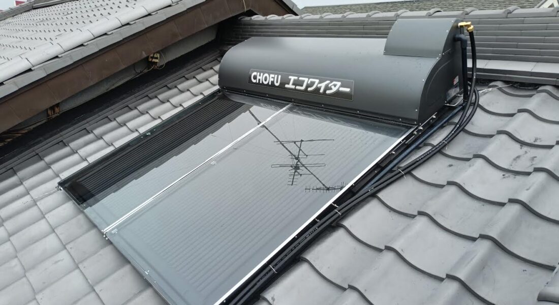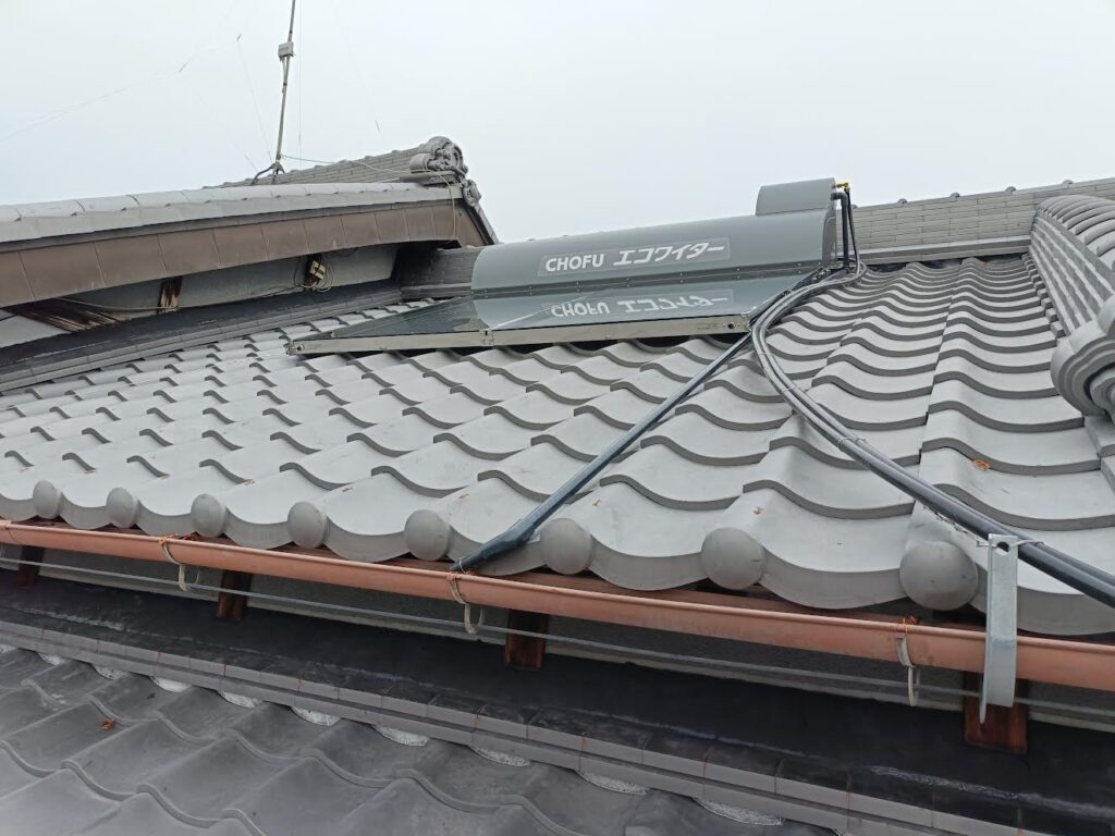 貯湯タンクが薄く瓦とよく似た色なのでスッキリ見えますね♪ オーバーフロー配管もトユまで設置させて頂きました。